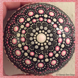 Seid mir gegrüßt bei Stein-Design! Ja, wenn man schon so einen royalen Stein im Sortiment hat, dann darf die Anrede ruhig auch königlich ausfallen, oder? Ich wollte schon die ganze Zeit einmal einen Stein in Grautönen malen. Eine Farbe dazu genommen kann das Ganze schön interessant aussehen. Klingt dröge, ich weiß, ist es aber nicht. Meine Wahl ist dann auf Pink/Rosa gefallen. Und zum ersten Mal habe ich mir hier regelrecht eine Vorlage für den Stein erstellt. Eine richtige Farbvorlage des Musters, das ich malen wollte. In Powerpoint am Computer. Hat Stunden gedauert, aber es hat sich gelohnt. Das Muster selbst habe ich diesmal auch mit Hilfslinien aufgetragen. Das hilft einem schon sehr, nicht ganz aus den Fugen zu geraten und zentriert zu bleiben. Nichts ist schlimmer, als mittendrin festzustellen, dass man nach einer Seite abdriftet. Die Bilderserie zeigt Euch genau, wie die Schritte abgelaufen sind. Das Ergebnis des Steins sieht irgendwie nach Spitzenmuster und Ballkleid aus, finde ich. Sehr hübsch, sehr zart, fast lieblich. Mir hat der Stein auf Anhieb gefallen und er liegt jetzt passend bei unserem Hochzeits-Foto-Buch. Denn ich hatte ja zu unserer Hochzeit schließlich auch ein Dirndl in rosa/weiß mit Spitzenbluse an. Das passt total gut zusammen. So hat der Stein einen schönen Platz gefunden. Als wäre er genau dafür gemacht. Manchmal muss es nicht knallbunt sein, aber so bunt wie mein Leben!
